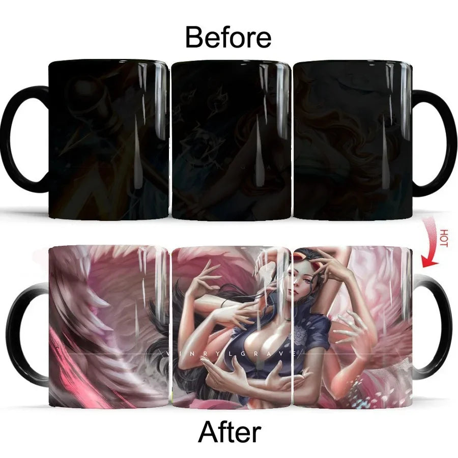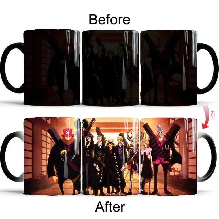 As soon as the hot water touches the mug, the dark exterior transforms completely, revealing a vibrant illustration of Luffy — as if his energy awakens with you.
